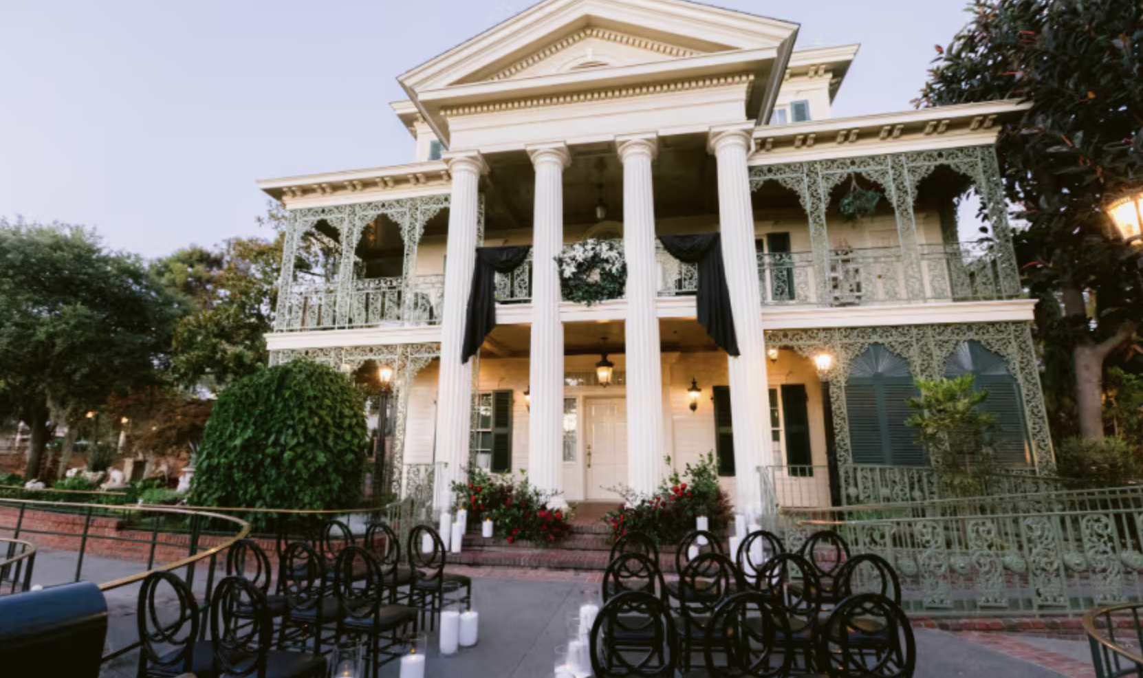 Courtesy of Disney’s Fairytale Weddings & Honeymoons, under the Disney Company || The Haunted Mansion Courtyard for a wedding