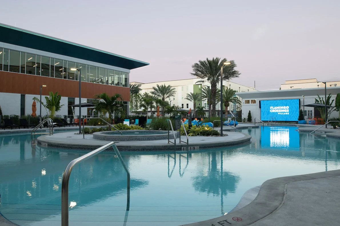 Where will I live? Participants have the option of living at Flamingo Crossings Village, an apartment complex owned by American Campus Communities. The apartments are furnished, and the complex provides resort-style pools, a fitness center, and study areas.
